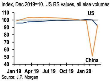 In addition to these factors, early evidence from China’s indicates that deep does not have to mean long as retail sales volumes having rebounded sharply back to 90% of their December levels.