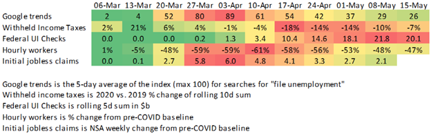 For example, below is a heat-map of high frequency US job metrics, using both conventional and unconventional economic data sources. The evolution of the data week-over-week is quite clear: mid-April was the peak for loss of employment, and all metrics have been steadily improving ever since (except for the value of unemployment cheques…although a rising number for that metric is arguably helpful in the near-term).