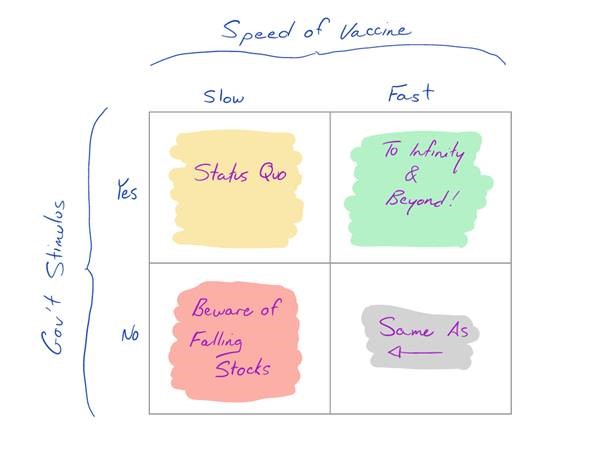 So, on the one hand we have an apparent early stage economic recovery that should still have room to run; and on the other we have a market that arguably has its eyes closed to a previously ignored risk factor that has become more real. This makes a case for doing some quick-and-dirty scenario analysis. Using vaccine timing and government stimulus as the two key market factors, you might envision a 2x2 scenario analysis matrix as follows: