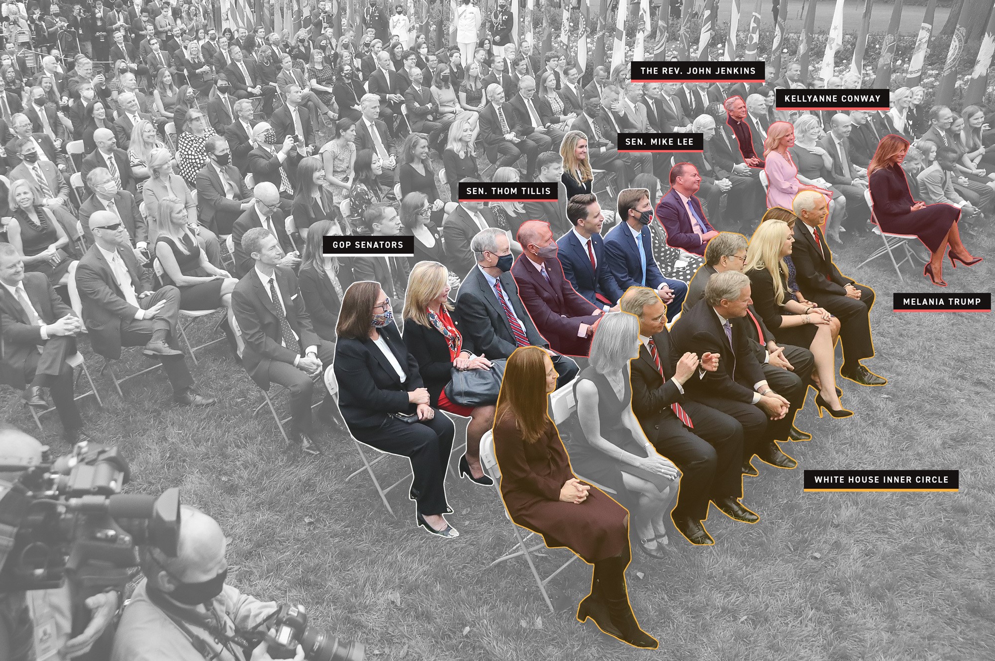 (Trump speaking to audience; red outline = confirmed COVID case)