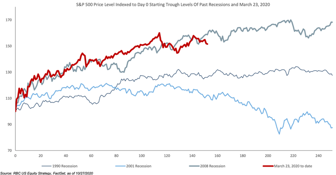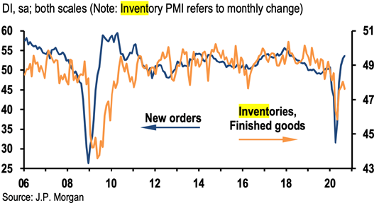 For example, the “lockdown” announced by Germany this past week will leave most shops, factories and schools open. That is a far cry from the sweeping, global closures in March and April that impacted supply chains of everything from toilet paper to electronics to pick-up trucks. In fact, the inventory restocking required by the severity of those spring closures is continuing to provide a strong tailwind for economic growth (see chart below). Economy-wide lockdowns caused US GDP to drop -31% annualized in Q2; by contrast, RBC CM’s Economics Team estimates that if even if new shutdowns in the US started today and reduced spending in COVID-sensitive sectors like hospitality, leisure and transport back to April levels, Q4 GDP would only drop by -4% annualized.