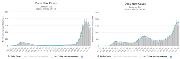 Daily new COVID cases with 7-day average: Italy (left) and USA (right)