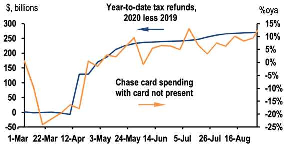 Looking forward, we now appear to have a clear financial bridge to this summer in place, suggesting that the outlook for investors remains bright. In Canada, government benefits were extended in late November, while more importantly in America, a $1 trillion-ish stimulus bill was finally passed last week. The first round of US stimulus from March provides context for the impact we can expect to see shortly: cheques were distributed to families rapidly, arriving in bank accounts within a few weeks and leading to an immediate and strongly positive increase in consumer spending, particularly online: