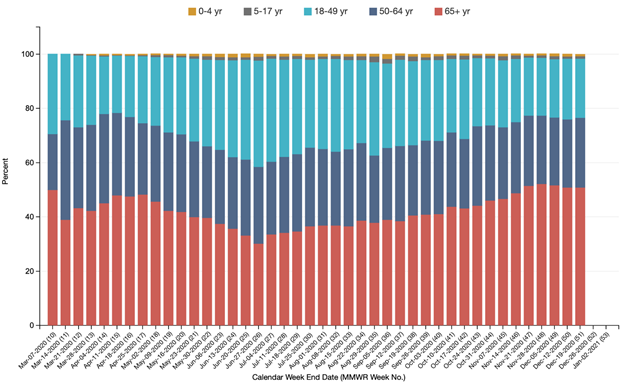 Granted, that leaves the question of whether markets are correct in focusing on the bridge to summer rather than on a more permanent, but more distant, line of sight to herd immunity. With the usual caveat of not being an epidemiologist, I’d argue the near-term focus is appropriate: if the crisis issue is hospital capacity, then the prioritization of inoculating seniors should lead to rapid relief. As a starting point, note the percentage of COVID-related hospital beds occupied by seniors: