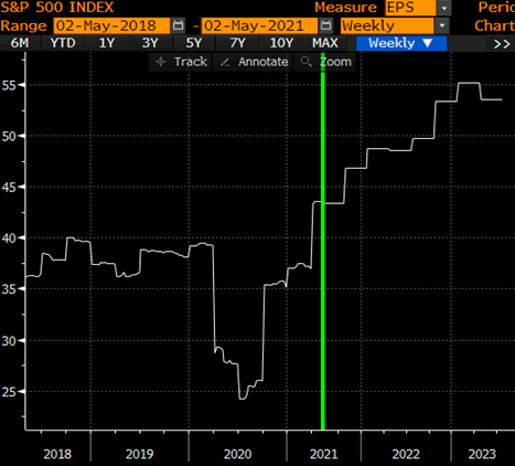 This anti-climactic trend has been most powerfully on display among FANG-ish companies, but it is also been evident more broadly. Over half of S&P 500 companies have now reported Q1 earnings and 86% have beaten analyst estimates, which is to say pretty much everyone. More importantly, a full earnings recovery has now occurred; operating profits for the market as a whole are tracking for about 10% above pre-pandemic levels this quarter.