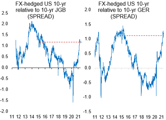 Japanese & German investors’ return on US Treasuries, relative to domestic equivalent: 2011 – present