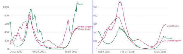 New COVID cases and hospital patients, as a percentage of population (per 100,000) UK, US and Israel: Oct 2020 – Present