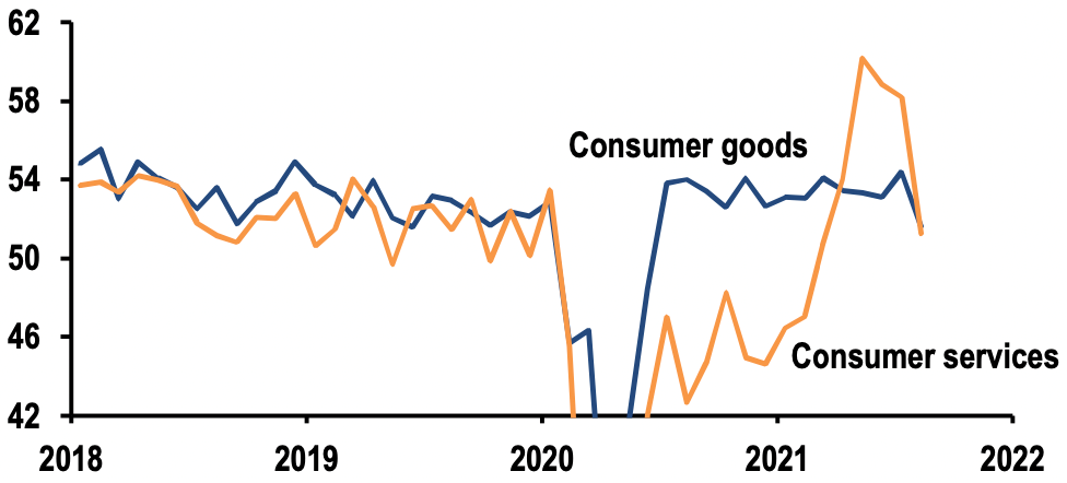 2. Increasing evidence that a smooth hand-off from spending-on-goods to spending-on-services as the key driver of economic growth has been interrupted. The former has been cut short by the supply chain issues mentioned above (auto sales have had the largest impact, now on track to decline by an eye-popping 25%), while delta has temporarily hit the pause button on the latter;