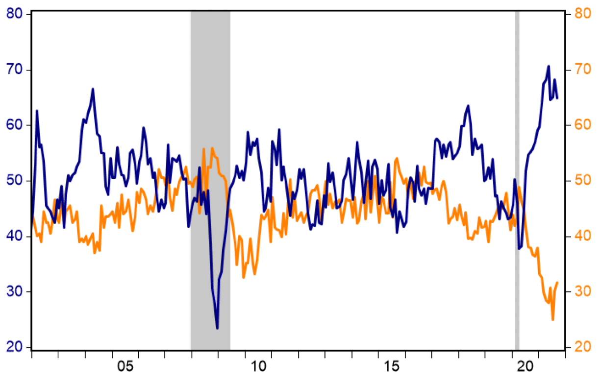 ISM Manufacturing Index: order backlog (blue) vs. inventories (orange): 2000 - Present