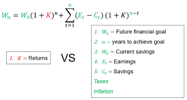 When we work with clients, we first determine what their financial goals might be. A future financial goal, W, n years from now is simply the funds you start with today, W at year zero, multiplied by the compounded rate of return, K. (For example, if K is about 7%, your investments would double in 10 years.) You then add what you save each year - your earnings - which are nothing more than what your earn, Et, less your expenses, Ct. We then also grow that by the same return for the balance of the remaining years (n-t). Of course, we account for taxes and inflation.