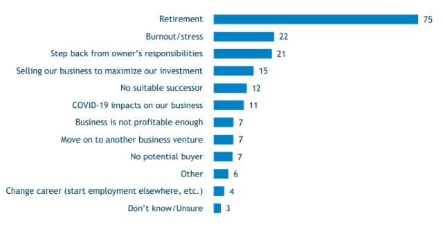 It's estimated that under 10% of business owners don't yet have a written succession plan in place, possibly risking the maximization in value of their primary source of wealth. Let's start with reasons for an exit of which the main impetus is retirement.