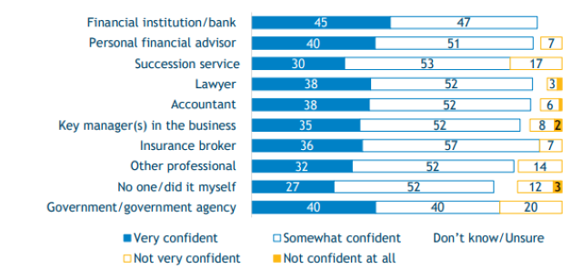 Although lawyers and accountants rank relatively highly in the survey, financial institutions and personal financial advisors, the latter typically working alongside the former, provide the highest level of confidence to business owners about their exit plans.