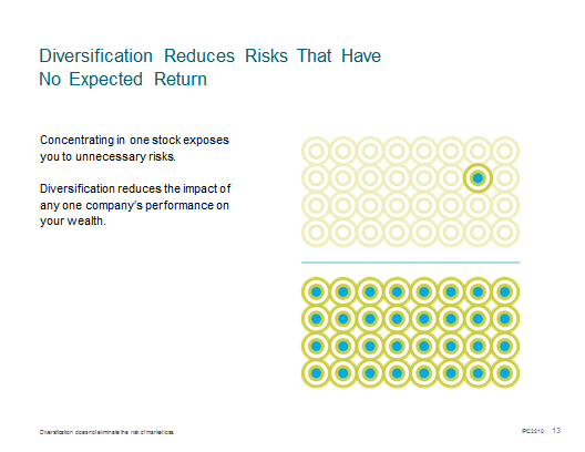 Diversification offers you wide, more manageable exposure to the market’s long-term expected returns as well as a smoother expected ride along the way. Perhaps most important, it eliminates the need to try to forecast future market movements, which