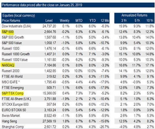 After a punishing 4th quarter (not just in Canada but globally), it has been a refreshing and much needed relief to witness the substantial market rebound in January. As of Friday Jan 25th, the S&P/TSX is back up +7.3% & the S&P500 is up +6.3%. If you take a look at the table below, you’ll note all major indices continue to have healthy annualized returns over the past 5 & 10 years.
