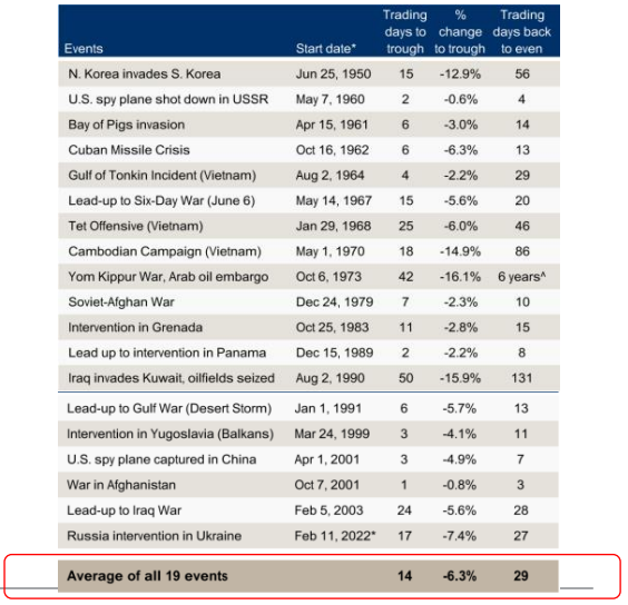 Below here is a history of all post-World War II geopolitical conflicts. Though each conflict presented a short-term correction, if you add them all up, it took an average of 29 trading days for the markets to bounce back. Yes, you read that correctly; one month for the markets to recover from war. And these wars tended to drag on for months or years. But by the time they were over, the markets hadn't just recovered, they had left those initial trading levels in the dust.