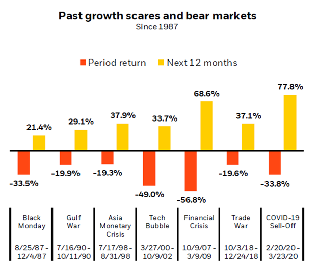 Then you might say the following: Fine, forget about black swan events. I understand those are impossible to predict and just as hard to act around. But surely we know when we have entered an economic recession. A technical recession is when we get consecutive quaters of contracting GDP. So, why don’t I just stop investing once a recession begins? Then I will start investing again once the economic data improves and the recession is over. However, you would be setting yourself up for failure. That’s because markets usually top out before the start of recessions and bottom out before their conclusion. In other words, the worst is over for stocks before it’s over for the rest of the economy. In almost every case, the S&P 500 has bottomed out roughly four months before the end of a recession. And if you don’t invest during a recession, you might be missing out on one of the best periods of performance the stock market has ever seen. Here is a chart showing stock market returns during a bear market, and then the 12 months following it. Look at the yellow. If you miss out on the yellow, you might as well take your ball and go home, because you may never catch up.