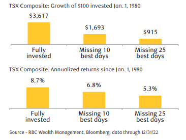 Ultimately, when you don’t invest, every day you aren’t in the market, you run the risk of missing out. You might think one day doesn’t matter in the grand scheme of the long term, but unfortunately that isn’t the case. If you invested $100 in the Canadian stock market in 1980, it would have been worth $3,617 by the end of 2022. What if you missed the 10 best days each year? It would be worth less than half that! $1,693 is what you would have by the end of 2022. Half your returns wiped out from 10 days each year. Look at the graph below.