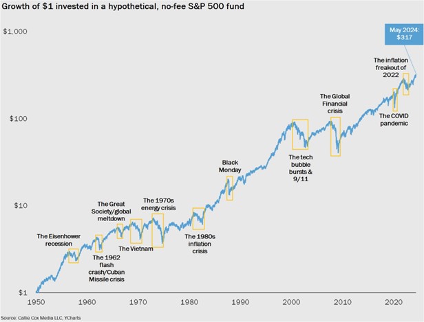 Below here you can see that $1 invested in the S&P 500 (which represents the 500 largest companies in the United States) at the beginning of 1950 would be worth $317 today, despite all the terrible events that occurred along the way. Did short term corrections occur? Of course. In fact, some of these corrections lasted months or years. However, the market always recovered, and eventually made new highs.