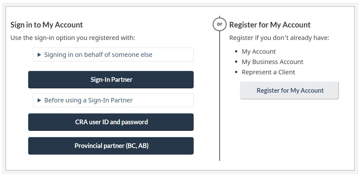 Scroll down to the sign in area. You can either log in through a sign-in partner (i.e. with your bank information) or login directly through CRA – either way is fine.
