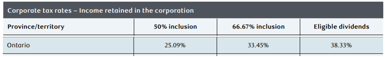 With the increase in tax on the first dollar of capital gains realized in the corporation, when looking at the passive investment income tax rates in a corporation, there is now an almost equality when earning eligible dividends and capital gains.