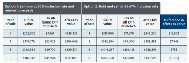 The following table shows the difference in after-tax value between selling now at the 50% inclusion rate versus holding and selling the security at a future date at the 66.67% inclusion rate.