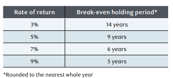 The following table shows the break-even holding period for the preceding example using the same assumptions but at various capital growth rates of return.