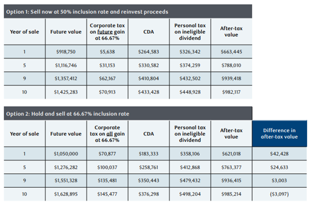 In the preceding table, the shareholder could expect the difference in after tax value to be the same sometime between the 9th and 10th year. Therefore, if the corporation expects to keep the securities and the shareholder will not extract the funds for at least 10 years, they will be better off not selling now and rather, holding the investment. If the corporation plans to hold the security for less than 10 years and the shareholder will be withdrawing the proceeds, they will be better off to sell before June 25 at the 50% inclusion rate.