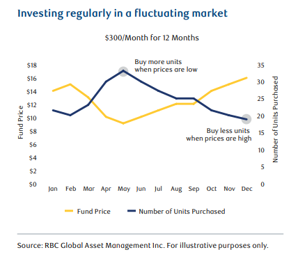 Regular investing also provides the opportunity to help smooth out returns over time, ultimately reducing overall portfolio volatility. This is achieved because investing a fixed dollar amount on a regular basis gives you a chance to buy more investment units when prices are low and fewer units prices are high, producing a more level investing experience over the long term.