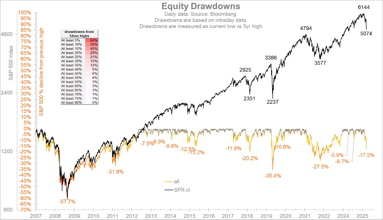 The S&P 500 is down 18% from its high and it has done so in short order. Declines of this magnitude happen every few years. The last one was in 2022 (-28%), the one before that was in 2020 (-35%) and the one before that in 2018 (-20%). So, this happens every few years, and the market always recovers, often quickly and sometimes slowly.