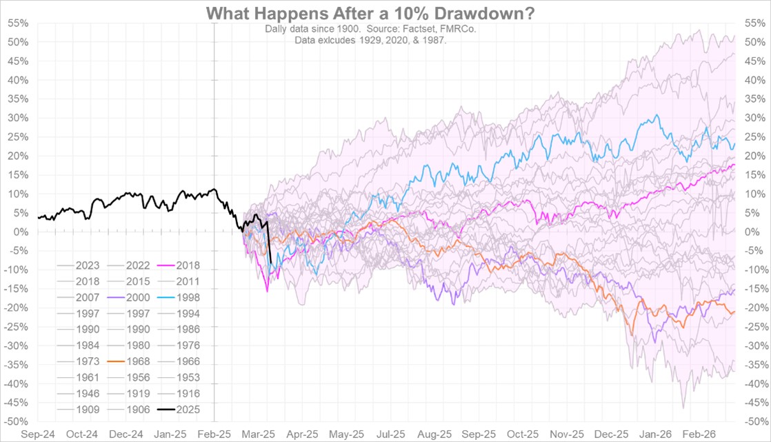 “What happens after a 10% drawdown?”. The good news is that we are now near the bottom of the range in terms of speed and magnitude. That suggests that the market could find some balance in the weeks ahead.