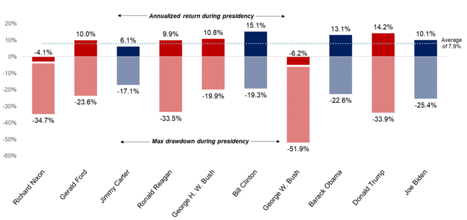 - Presidential terms have posted an average drawdown of 28.2%, while offering an average annualized return of 7.9% since 1969. This highlights the intermittent volatility that short-term markets can display, but also the consistent positive returns that long-term markets can deliver, regardless of the president.