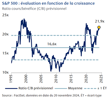 La vigueur des marchés boursiers nord-américains cette année a été impressionnante, les indices boursiers ayant fortement progressé. Ironiquement, ces gains ont mis de l’avant l’une de nos principales préoccupations à l’égard des actions : les valorisations. De ce point de vue, le ratio cours/bénéfice du marché boursier américain – une mesure clé reflétant le prix que les investisseurs sont prêts à payer par dollar de bénéfices prévus – se situe tout juste au-dessus de 22 fois les profits, ce qui est nettement supérieur à la moyenne des 30 dernières années de 16 fois les profits. Bien que cette donnée ne renseigne guère sur le rendement des actions au cours des prochains mois, elle donne à penser que le marché boursier américain reflète beaucoup de positivité, d’optimisme et de grandes attentes quant à la croissance future des bénéfices.