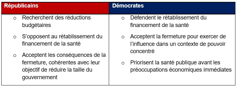 La fermeture du gouvernement américain a entraîné la mise à pied temporaire d’environ 750 000 employés fédéraux. Le différend budgétaire tourne autour des dépenses en santé : les démocrates souhaitent leur rétablissement tandis que les républicains plaident pour des compressions. Les deux partis semblent prêts à supporter la fermeture, bien que la pression publique augmente à mesure que les salaires ne sont plus versés.