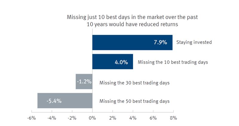It is extremely difficult to time the market both perfectly and consistently. You not only need to know when to sell to avoid the downturn, you must also know when to buy back to participate in the upswing. Missing out on this upswing has a very marked effect on long-term returns as you can see in the chart below. Staying on the sidelines on just 10 of the best trading days over a 10 year period cuts your return by almost half (4.0% vs 7.9%) as compared to simply staying invested. If you missed out on 30 of those days, you would have experienced a slight loss, and if you missed out on 50 of those days, it would have been a significant loss – those are some very significant differences!