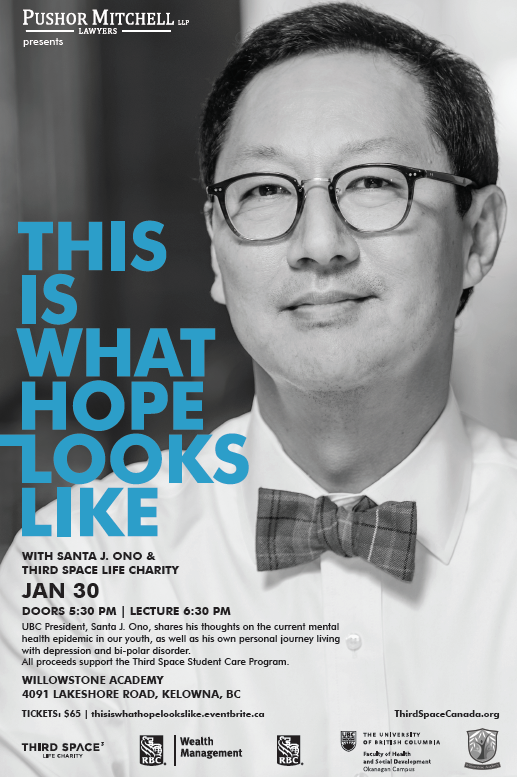 Professor Ono will share his thoughts on the current mental health epidemic in our youth, and his journey in living with depression and bipolar disorder. "Suicide is a real risk for university-age youth, and we need them to know they are not alone," says Ono.