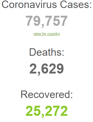 As of Feb. 24th, 2020, 79,757 cases have been confirmed (with 2,412 confirmed outside of China).