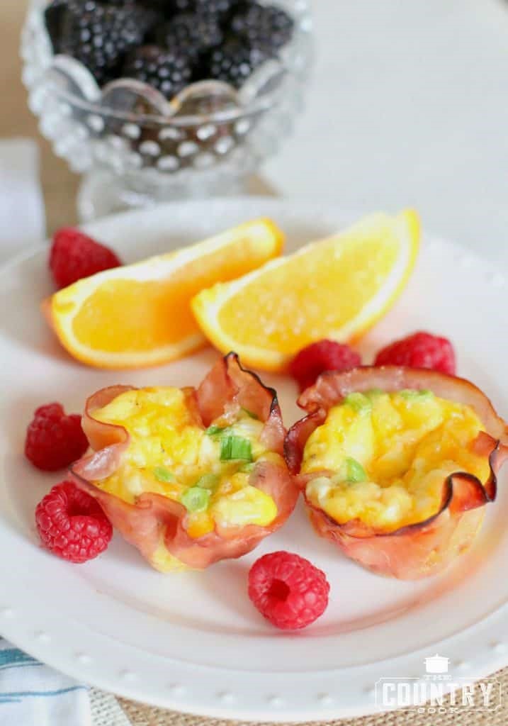 Place individual ham slices over each muffin cup and gently press down in the middle until a cup shape forms. In the bottom of each ham cup, add in about a tablespoon of shredded cheese.