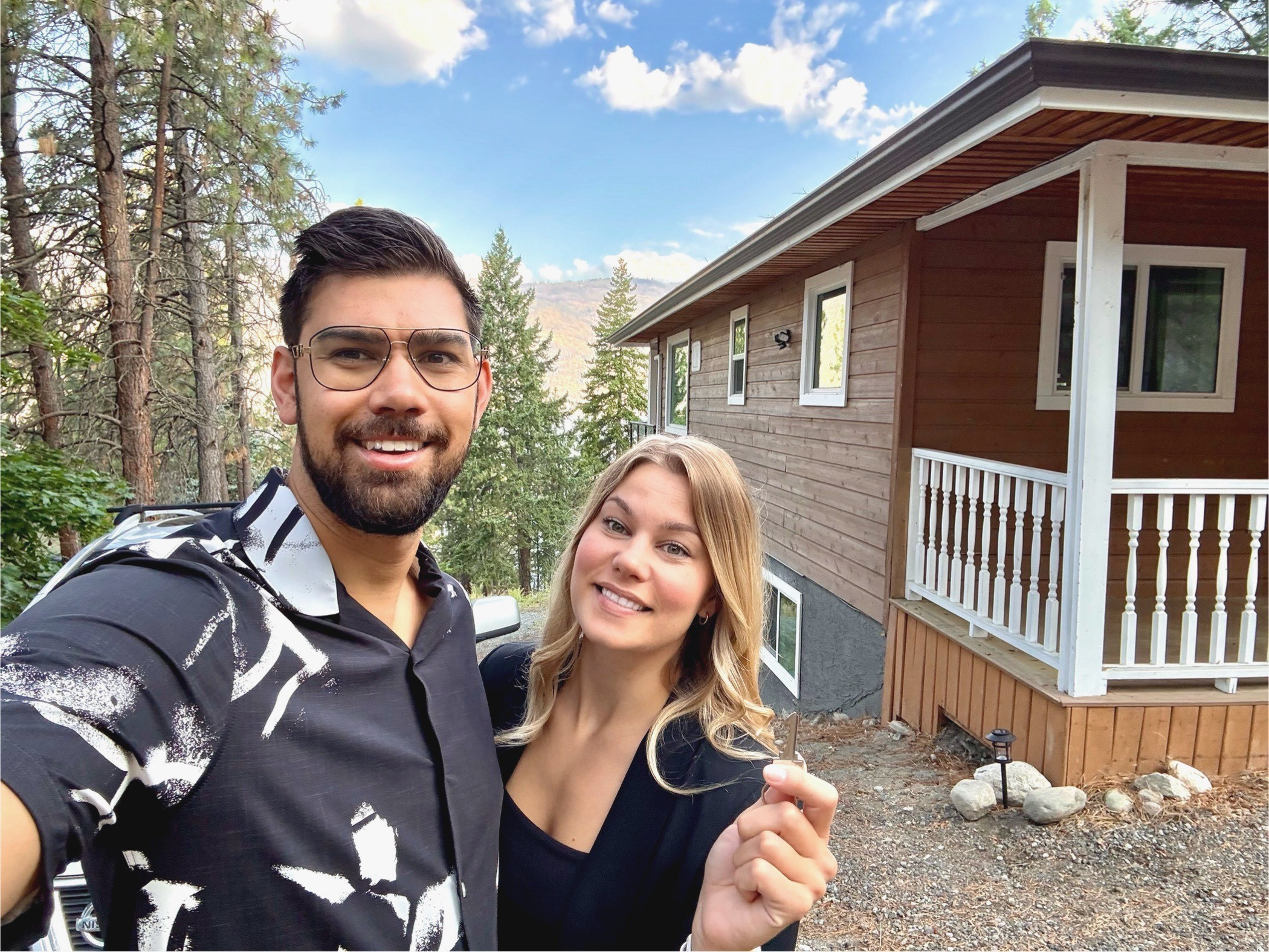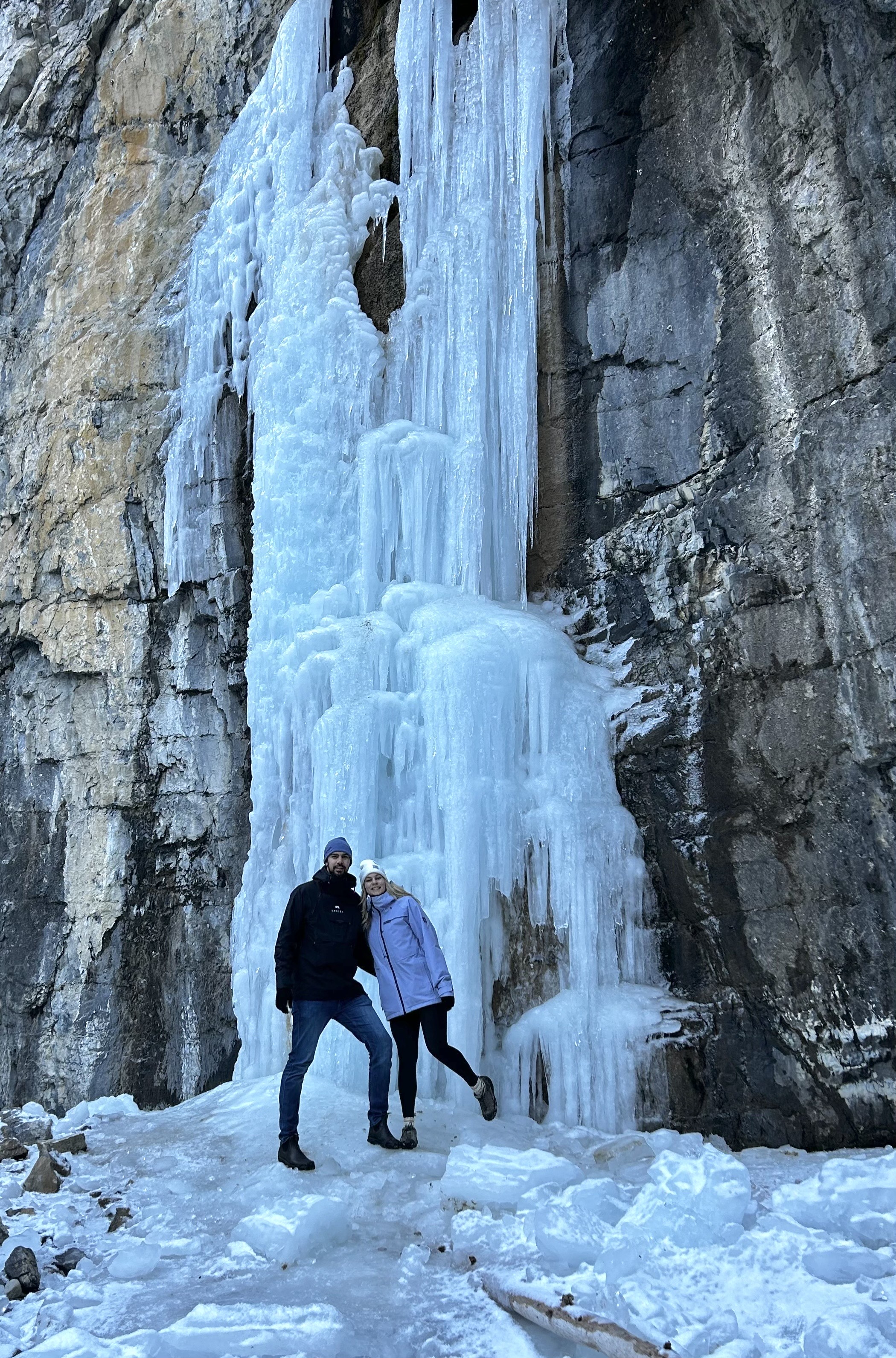 Ally and her partner Austin at a frozen river hike in the Kananaskis (above) and skiing at Big White (below)