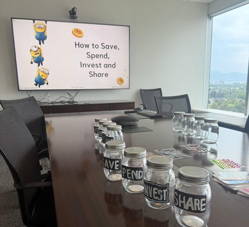 It didn’t take long before the table was covered in stickers, the jars were filling up, and the kids were coming up with their own money strategies. (Let’s just say some future investors might already be in the making!) Carey and Angela shared in the fun, helping the kids think about choices, trade-offs, and dreams—all while keeping things playful.