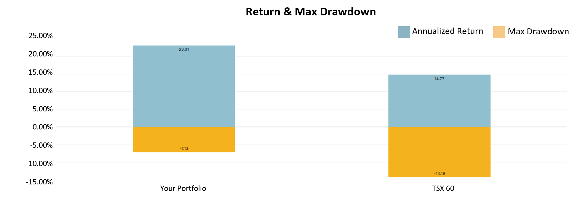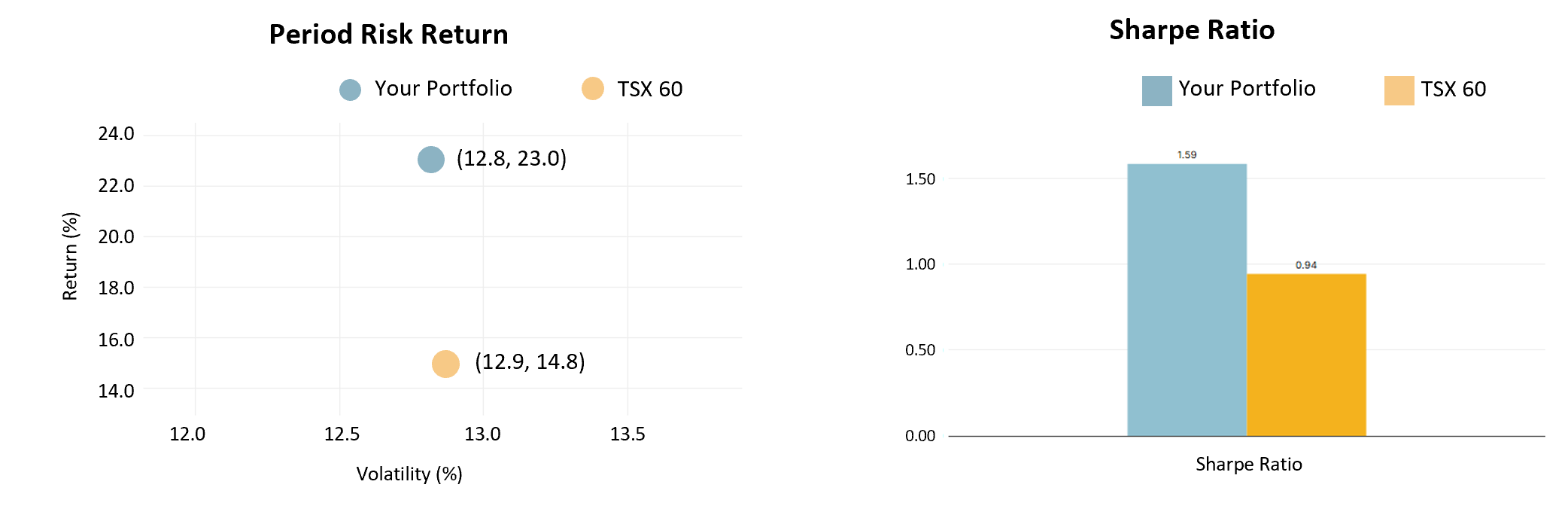 Period Risk-Return Graph: Visualizes the risk and return exposure of your portfolio versus the TSX 60. Your portfolio achieved higher returns with lower volatility.