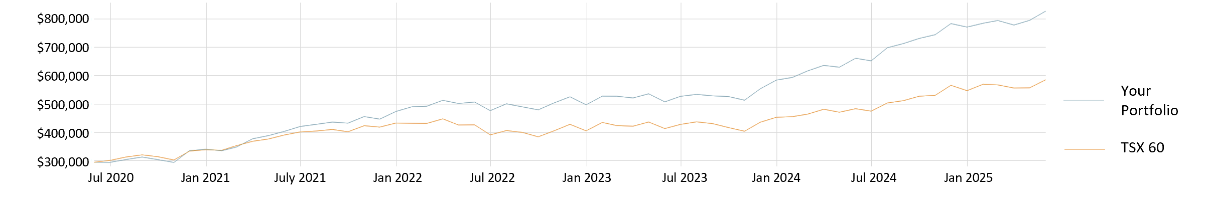 Below is a sample analysis of a portfolio with Canadian Equities from May 31st 2020 to May 31st 2025.