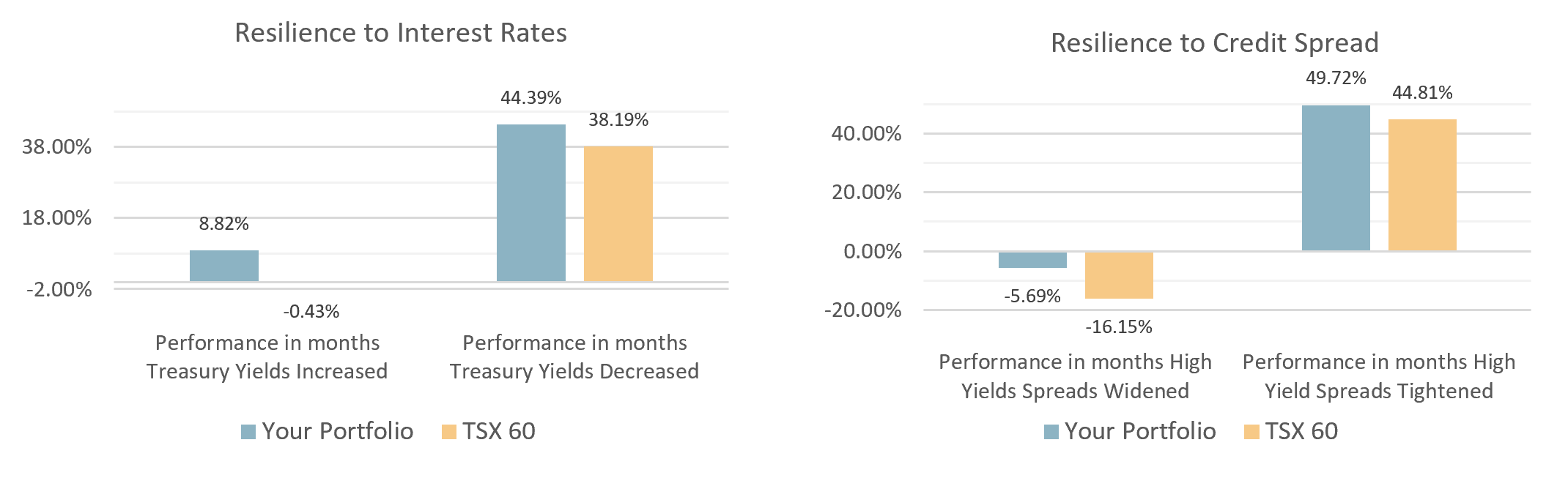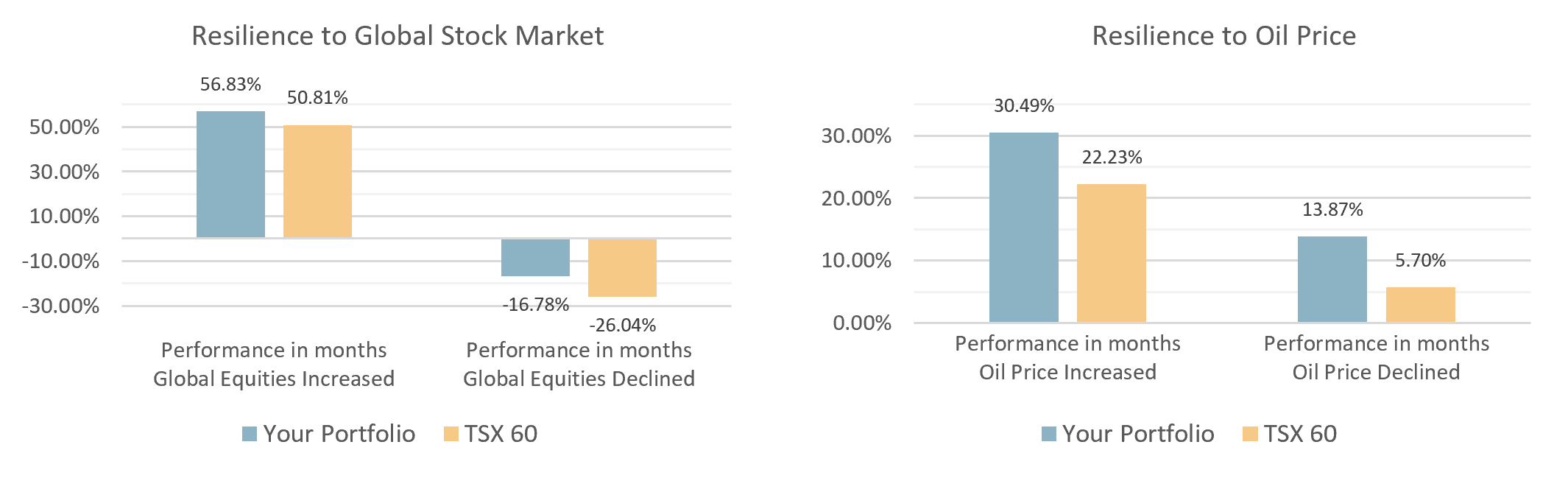 Resilience to Oil Price: Shows how both portfolios performed when oil price were rising or falling. Your portfolio outperformed TSX 60 ETFs in both rising and falling oil price scenarios.