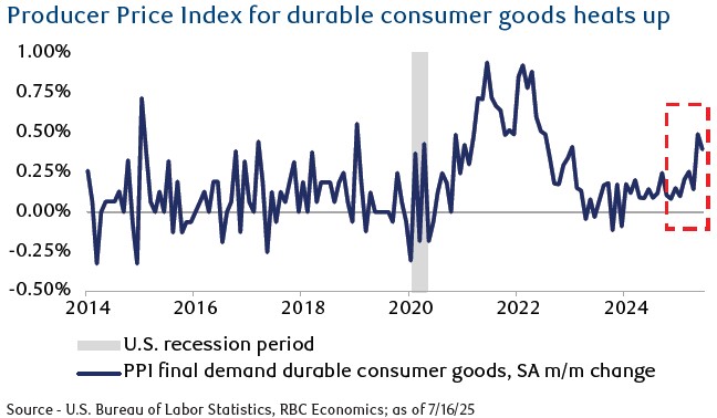 We expect this will start to appear in the Producer Price Index (PPI)—which tracks what businesses pay for goods at different stages of production (raw materials, intermediate inputs, and final goods). Already, we’re seeing price increases in finished durable goods, like furniture and electrical appliances.