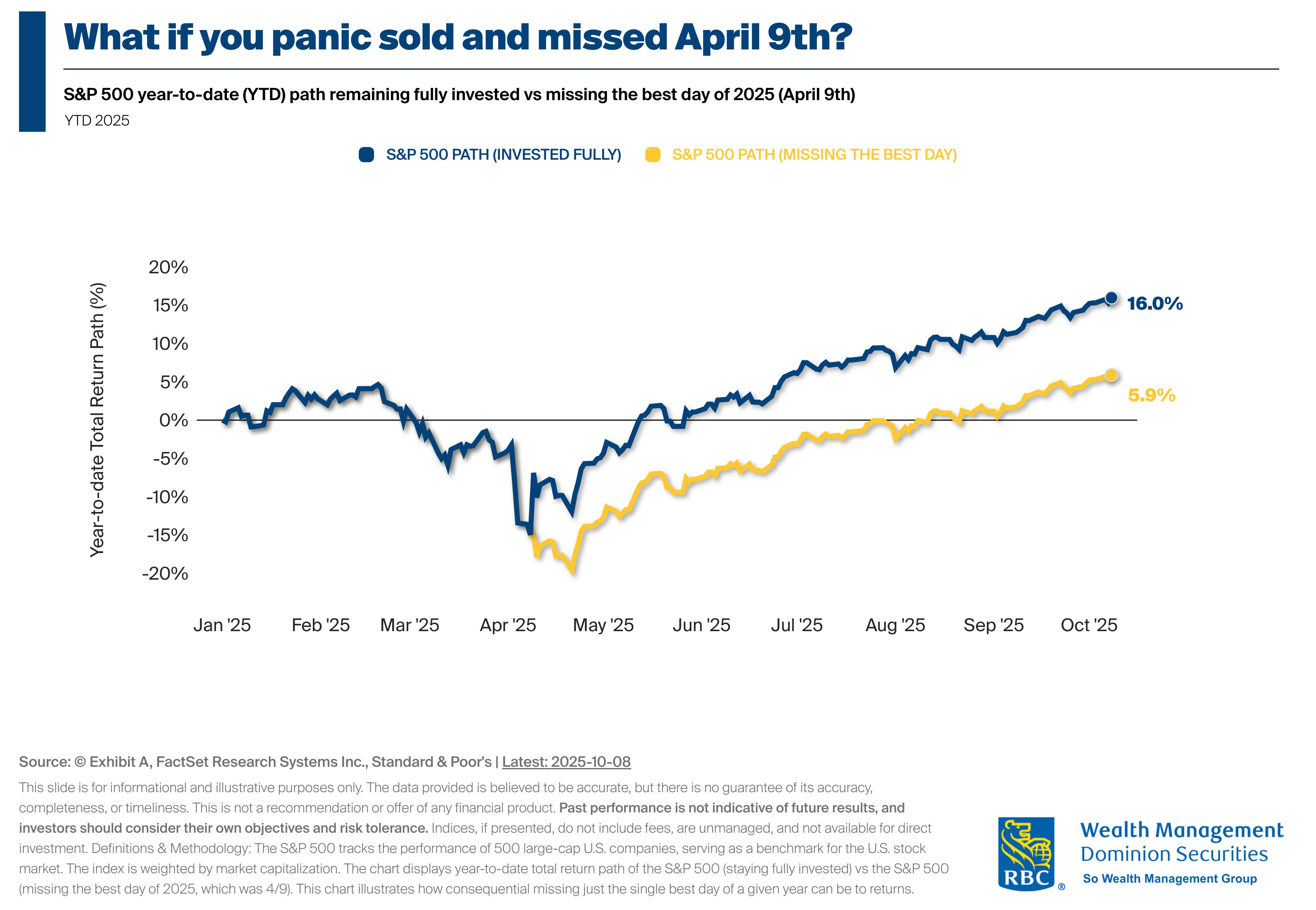 - A Look at the Data: Through October 8, 2025, the S&P 500 has gained 16.0% year-to-date. But when you remove April 9th, this year's best day so far, returns fall off a cliff, dropping to 5.9% just by missing the one best day. That's a meaningful chunk of progress lost, showing how dangerous it is to try and time the market.
