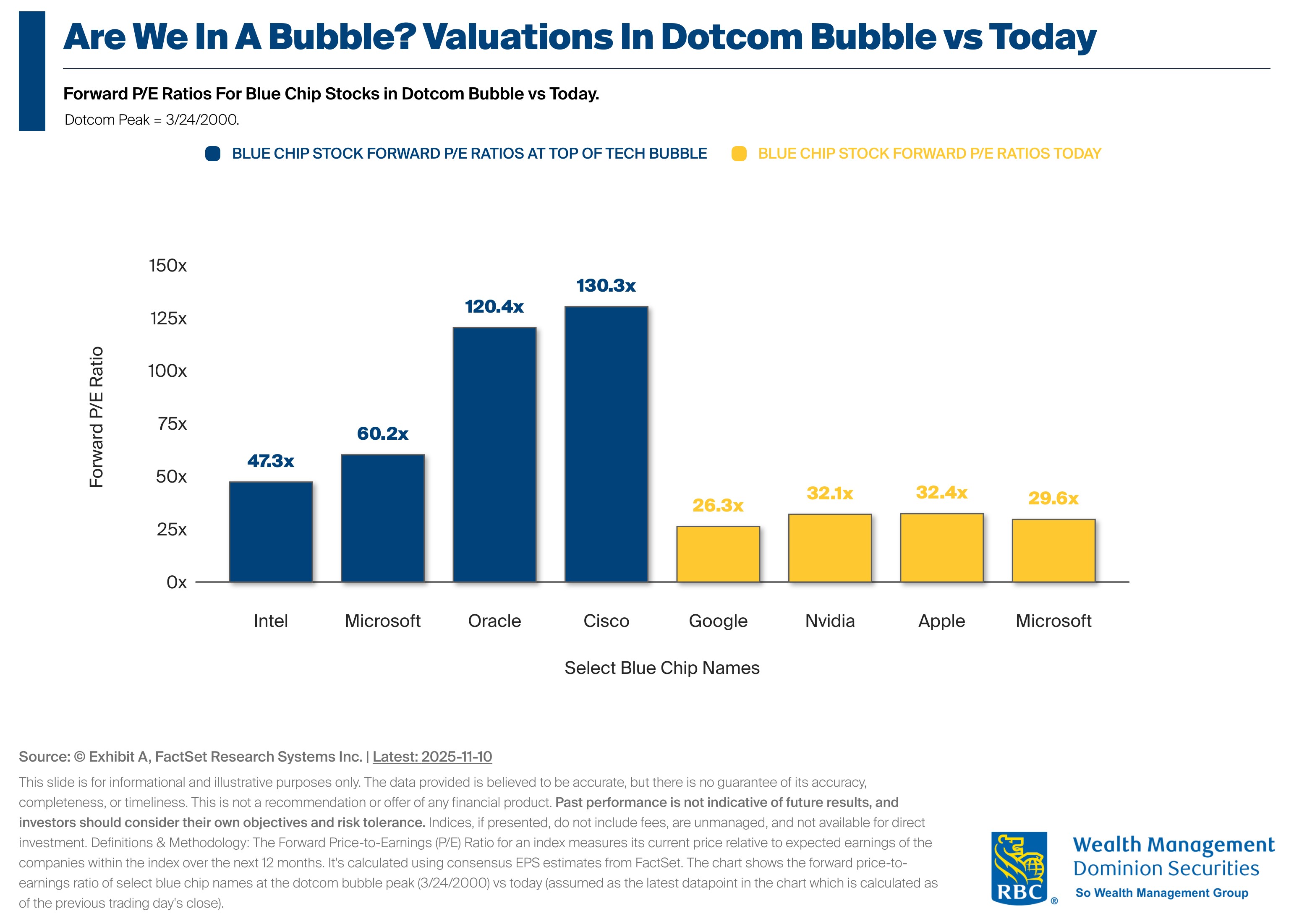 A Look at the Data: At the March 2000 peak, leading tech names like Cisco and Oracle traded at extreme valuation multiples, with forward P/Es well above 100x. Today's largest S&P 500 constituents trade at far lower levels.