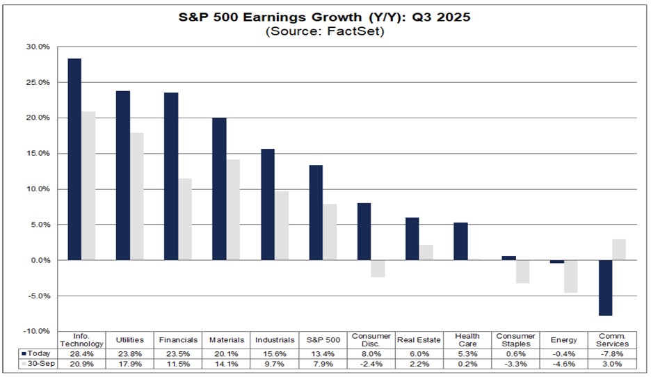 We recently wrote about the contributions to stock market returns – which showed earnings growth as the primary driver of the S&P 500 gains year-to-date. This week we’re taking a ‘pulse check’ to examine the health of corporate revenue and profit growth. With nearly all S&P 500 companies reporting Q3 2025 results (as of November end), the season wrapped up strong: 83% of companies beat earnings estimates and 76% topped revenue forecasts, both well above historical averages.