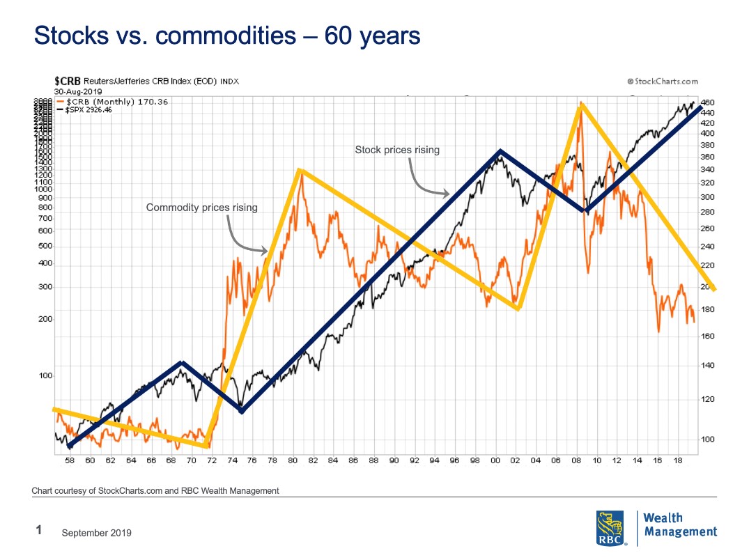 From time to time, investors ask us whether or not they should get into gold, oil, or other commodities. It seems that the commodity sector has the ability to excite certain investors, especially when the timing could be opportune. Before we answer these questions, let’s look at the below chart of the CRB index, to observe how commodities have performed over the past sixty years. The CRB Index is a basket of commodities, consisting of about 39% energy, 41% agricultural, and 7% precious metals, and 13% base/industrial metals in its composition.