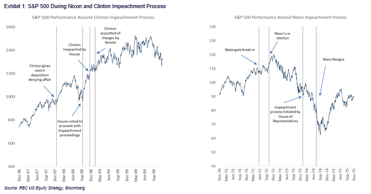 It is difficult to conclude how markets would respond to the advancement of an impeachment inquiry, since it is such a rare occurrence. In January 1998, during the height of the Clinton-Lewinsky scandal that led up to his impeachment, the US was experiencing one of the greatest bull markets in US history. Yet, during the Watergate scandal, the S&P 500 fell 39% between 1973, when the Watergate investigations commenced and August 9th, 1974, when Nixon submitted his resignation. It is important to note, however, that this drop cannot be fully attributable to the scandal. A number of other forces were at play, such as the second devaluation of the dollar, rapid increases in price inflation and massive insurance fraud. In addition, subsequent to his resignation, the stock market rose 30% over the following 3 years.