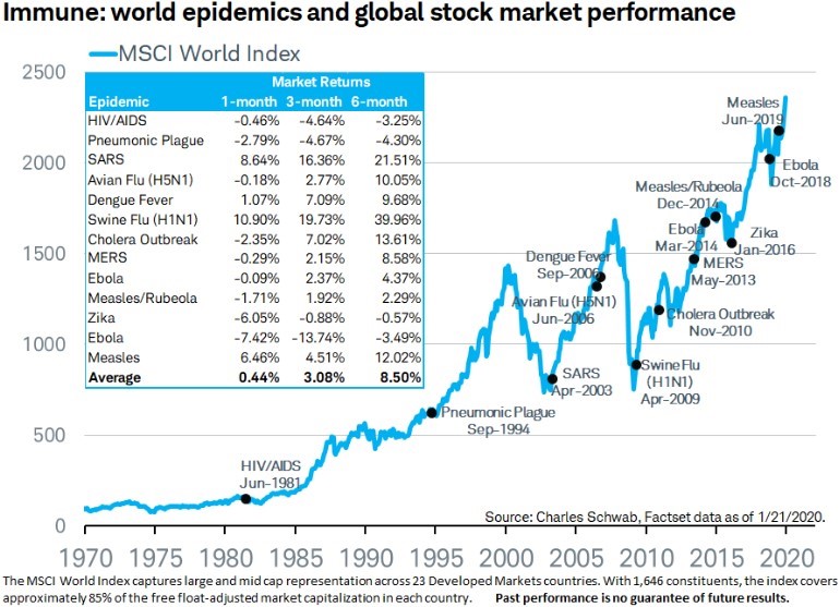 The following charts from MarketWatch help to provide context around the equity market’s performance during past outbreaks.