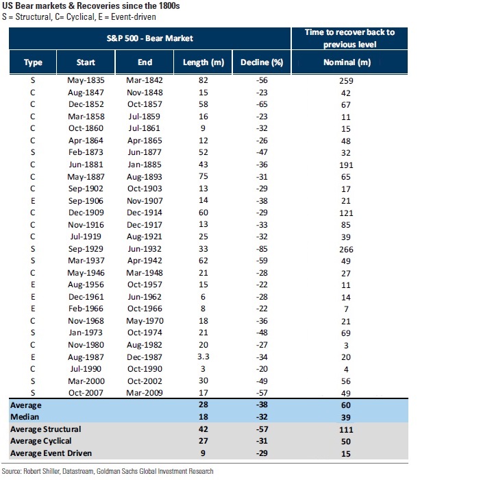 Goldman Sachs Research has published a useful chart of US Bear Markets since the 1800s. Below you can see that they categorize each type of bear market, detail the magnitude of the declines and provide the duration of each recovery.